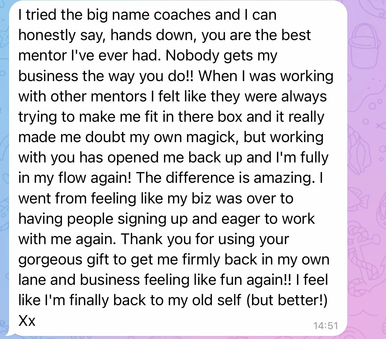 After launching my business in 2021, I scaled to six-figure months with a beautifully stripped-back business model. No burnout. No 27-step funnels. Just powerful AF strategy and deep energetic alignment.